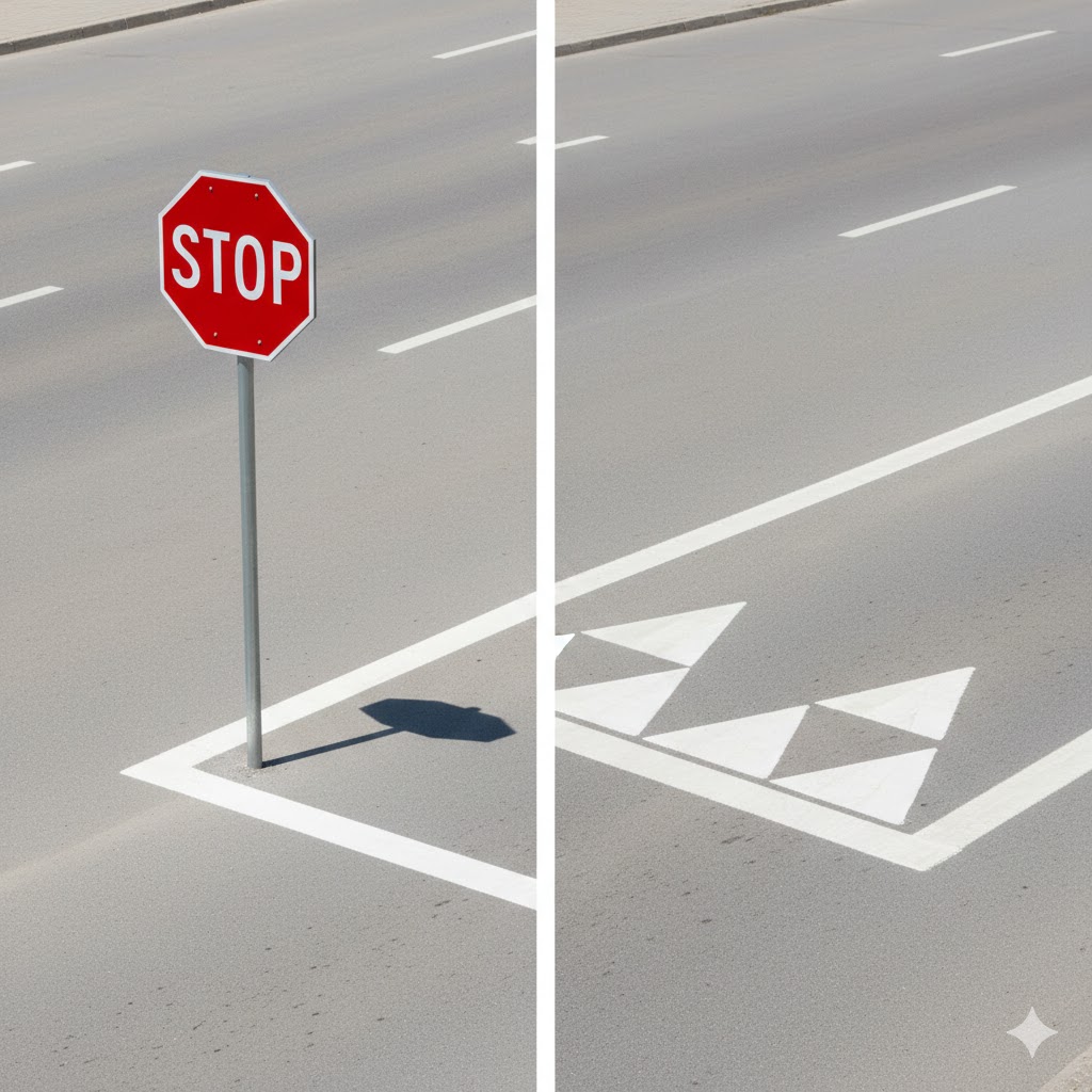 Selvom både hajtænder og stopskilte signalerer ubetinget vigepligt, er der en væsentlig forskel i den fysiske handling, der kræves af dig. Ved hajtænder skal du holde tilbage for tværkørende trafik, men hvis der er helt frit, må du i princippet trille igennem med lav fart. Ved et STOP-skilt er reglerne strengere; her skal køretøjets hjul stå helt stille bag stoplinjen, uanset om der kommer nogen eller ej.